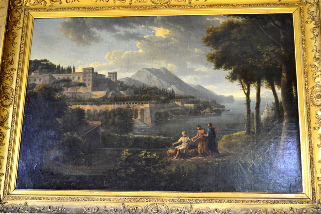 Italian School. Landscape with Castle and High Cliff on an inlet from the sea. Classical figures in foreground.