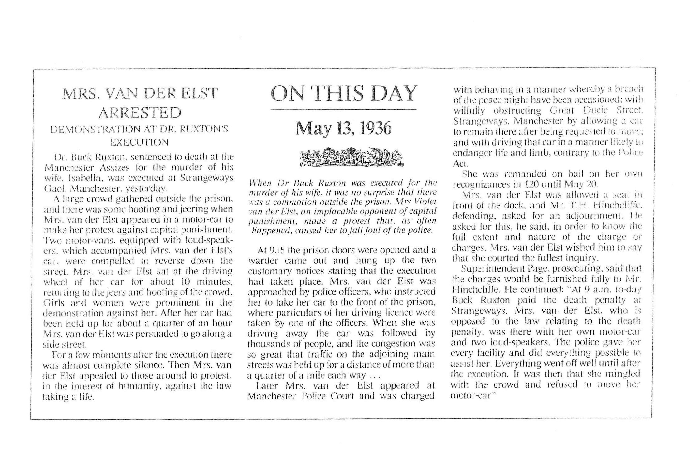 Most famous for her activism against capital punishment, Van der Elst believed that criminals suffered while imprisoned, and did not deserve to be executed for their crimes. She wrote many speeches regarding cruelty towards prisoners, which were projected through loud speakers attached to the back of her infamous yellow and black Rolls Royce. These speeches were a form of protest that occurred outside prisons on the day of an execution. Violet Van der Elst was arrested six times as a result of staging these public protests.