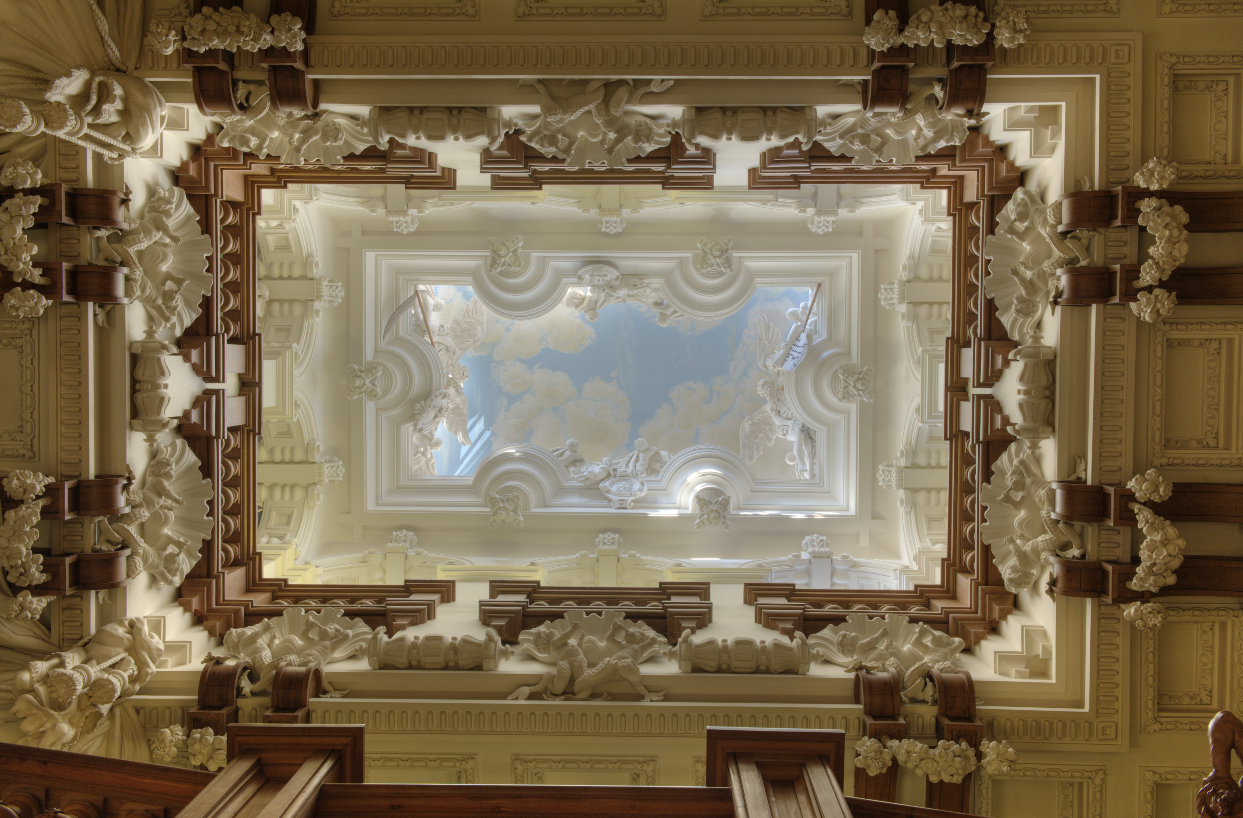 There is also a roundel portrait, thought to be of Gregory (Pevsner, 1989). All about the landings and stairway are drapes and billows of what appear to be cloth, but are in fact plaster. The ropes appearing to be plaster are actually rope dipped in gypsum, sand and water, with animal hair used as a binding agent. Cherubs, bronzes, Atlas figures, caryatids, putti, and cockleshells constitute one of the most fantastic and extravagant expressions of Baroque style in the country.