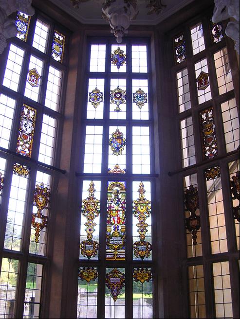The stained glass is by the Thomas Willement (1786-1871). He was instrumental in reviving the art of stained glass, especially heraldic glass. “Willement had been the armorial painter to George IV (1820-1830) and became, by Royal Patent, “Artist in Stained Glass” to Queen Victoria. He made much armorial glass for St George’s Chapel, Windsor, and restored its ancient windows. He was one of the 25 stained glass artists who exhibited at the Great Exhibition at Crystal Palace, 1851.” The stained glass window at Harlaxton is dated 1837. (British Ancestry, 2007)