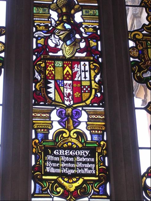 Below the shield the stained glass commemorates the union in 1547 of Jean de Ligne, the baron of Barbencon with Marguerite, the hereditary countess of Aremberg. The last shield on the lower left vertex of the triangle ties this line back to Gregory Gregory.