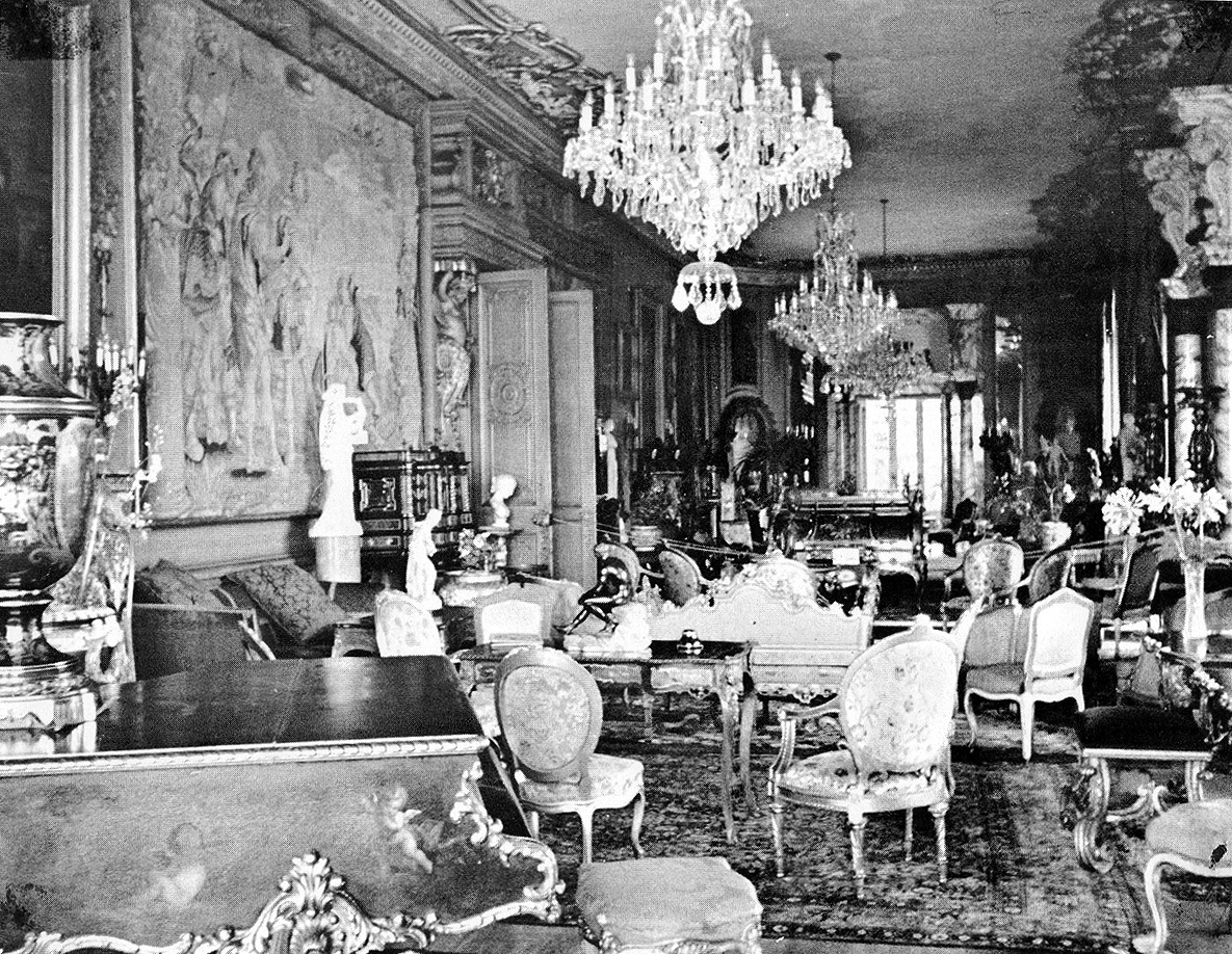 The Long Gallery was formerly known as the Tapestry Gallery. “The walls of this splendid gallery are decorated with Gobelin tapestry, wrought so perfectly and artistically as to equal oil paintings. They were brought from Paris where they were originally intended for one of the royal palaces. The two pieces over the fireplaces – “Vulcan forging the Bolts of Jove” and “Bacchus” are very large. The chairs and sofa are covered with Obisson tapestry richly wrought. On the marqueterie tables are a crystal casket, Florentine ditto, Japan and China vases, cabinet of gems etc. On a marble slab within the western bay is a Chinese idol, whose strange faculties are hideously portrayed. An elaborate ebony cabinet, and another one inlaid with mother-of-pearl are distinguishable objects. A pair of boxwood frames representing fruit and flowers are exquisite carvings by the celebrated Grinling Gibbons.”