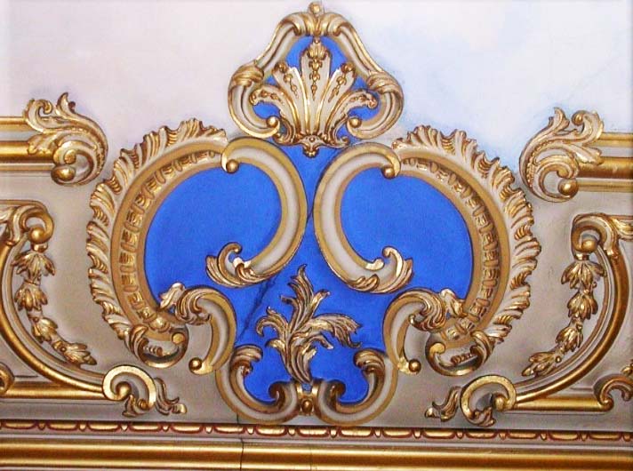 Detail of swirls and shell-forms in the ceiling of the Long Gallery ceiling evoking a GG monogram (Photograph: M. Valenzuela)